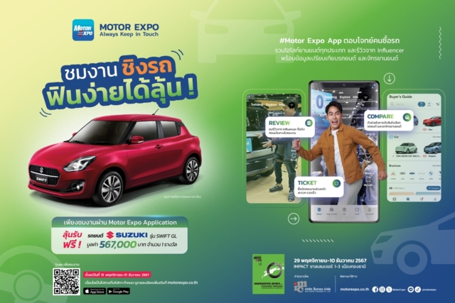 ดาวน์โหลด MOTOR EXPO APP ทั้งระบบ iOS และ Android รับสิทธิ์ร่วมกิจกรรม “ชมงานผ่าน MOTOR EXPO APP ชิงรางวัล" รถยนต์ SUZUKI รุ่น SWIFT GL มูลค่า 567,000 บาท จำนวน 1 รางวัล ตั้งแต่วันที่ 15 พฤศจิกายน–31 ธันวาคม 2567