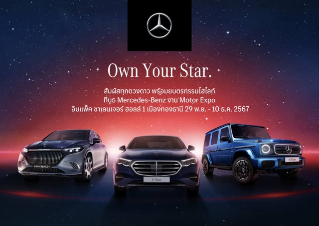 เบื้องหลังแนวคิดแคมเปญ “Own Your Star” มาจากสัญลักษณ์ดาวสามแฉกของเมอร์เซเดส-เบนซ์ ซึ่งเปรียบยนตรกรรมแต่ละรุ่นเสมือนดวงดาวแต่ละดวงที่รอให้คุณมาครอบครอง โดยมีดาวดวงใหม่ที่กำลังจะเฉิดฉายในงาน Motor Expo ที่จะถึงนี้ อย่างยนตรกรรมที่เปิดตัวล่าสุด ได้แก่ G-Class ทั้งรุ่นเครื่องยนต์ดีเซลและรุ่นพลังงานไฟฟ้า EQ Technology, Mercedes-Maybach EQS SUV, E-Class รุ่น Exclusive Line และ V-Class รวมถึงดวงดาวอีกหลายเซกเมนต์