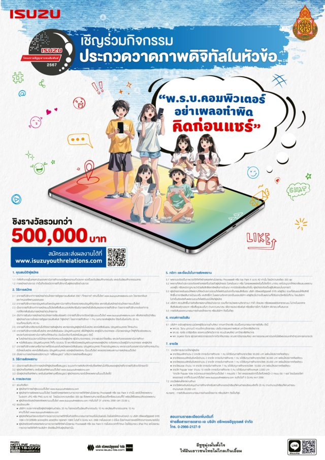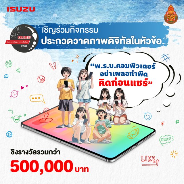 เชิญชวนนักเรียนระดับมัธยมศึกษาสายสามัญทั่วประเทศ ร่วมส่งผลงานรูปแบบดิจิทัลสุดสร้างสรรค์ในรอบคัดเลือก ภายใต้หัวข้อ “พ.ร.บ.คอมพิวเตอร์ อย่าเผลอทำผิด คิดก่อนแชร์” ผ่านเว็บไซต์ www.isuzuyouthrelations.com ตั้งแต่วันนี้ – 31 มกราคม 2568 ชิงรางวัลทุนการศึกษาพร้อมโล่ประกาศเกียรติคุณ มูลค่ารวมกว่า 500,000 บาท