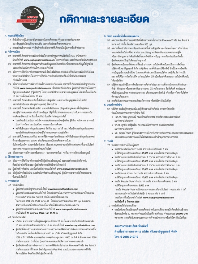 ผู้ที่สนใจสามารถหาข้อมูล และสมัครเข้าร่วมการประกวดวาดภาพดิจิทัล ในโครงการ “อีซูซุเยาวชนสัมพันธ์ 2567” ได้ที่ www.isuzuyouthrelations.com