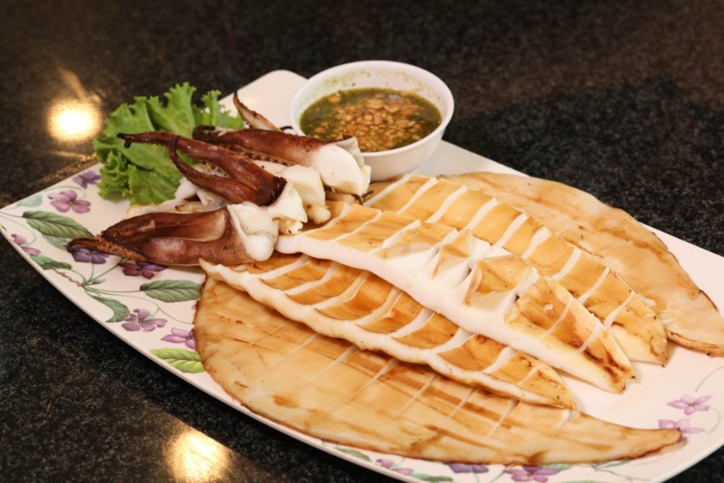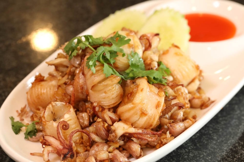 - หมึกไข่ทอดกระเทียม : ใช้หมึกไข่ที่มีไข่เยอะ โดยทอดใช้เวลาไม่นาน ทำให้ไข่ไม่แข็ง และใส่กระเทียมเจียวแบบไม่อั้น