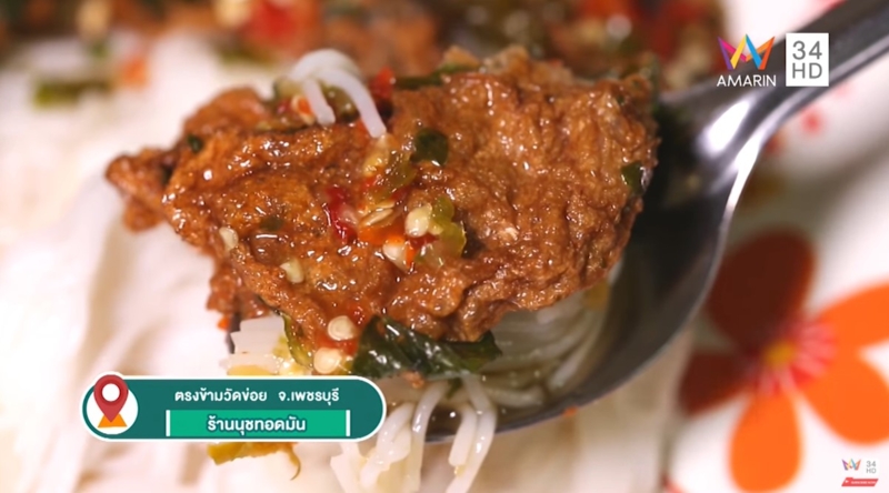 ร้านนุชขนมจีนทอดมัน อาหารท้องถิ่นคนเมืองเพชร ตกทอดกันมากว่า 4 รุ่น ทอดมันเนื้อแน่นหอมเป็นพิเศษด้วยเครื่องแกงและใบกะเพราสด ที่ถูกทอดจนพอดี เสิร์ฟพร้อมขนมจีนเป็นการรวมตัวของเมนูฮิตของคนเมืองเพชรเลยก็ว่าได้ แต่นอกจากความเข้ากันแบบไม่น่าเชื่อของทอดมันกับขนมจีนแล้ว ทีเด็ดที่เป็นตัวเชื่อมให้ความอร่อยลงตัวยิ่งขึ้น คงหนีไม่พ้นน้ำจิ้มสูตรเด็ดที่มีส่วนผสมของน้ำตาลโตนดแท้ๆ ปรุงมารสชาติจัดจ้านทั้งหวานเผ็ดและหอมผักชี เป็นไม้ตายของทางร้านที่ทำให้ทอดมันชูโรงขึ้นมาได้อย่างสมบูรณ์แบบ