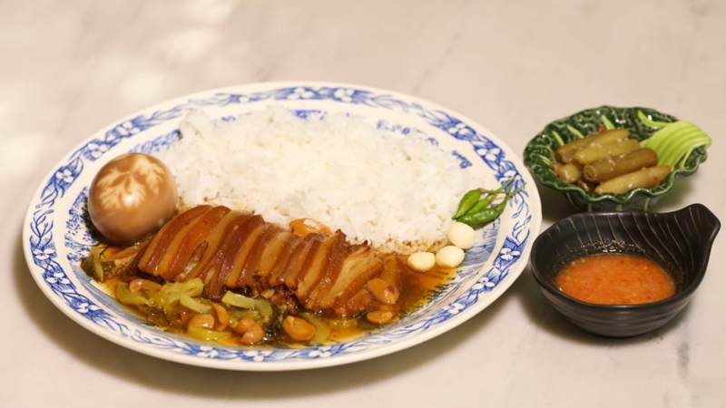 - ข้าวพุงหมู (ราคา 190 บาท) - นำหมูสามชั้นมาผ่านกระบวนการทั้งทอด ทั้งต้ม ทั้งนึ่ง ใช้เวลากว่า 8 ชั่วโมง ทำให้ได้ออกมาเป็นเนื้อหมูมันละลายหายไปในปาก ทานคู่กับน้ำจิ้มซีฟู้ด ไข่ต้มดองใบชา และพริกกระเทียมสดๆ
