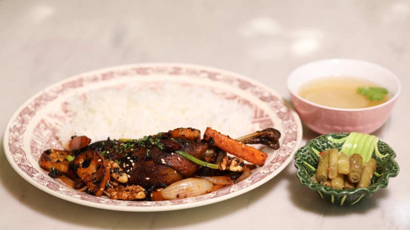 - ข้าวเป็ดพะโล้กงฟีผัดหมาล่า (ราคา 280 บาท) - หมักน่องเป็ดส่วนสะโพกด้วยสารพัดเครื่องเทศ เหล้ากุหลาบ น้ำผึ้ง และซอสต่างๆ ไว้ถึง 2 วัน จากนั้นนำมาผ่านกระบวนการทำให้เปื่อยนุ่มหนังบางอีก 1 วัน แล้วถึงจะมาทอด ผัดเคลือบซอสให้ทุกคนได้ทาน หนังจะกรอบมาก