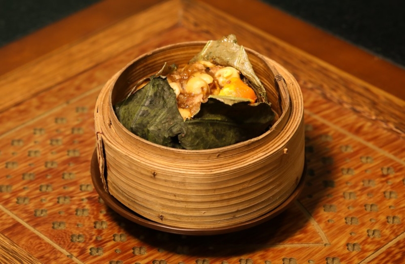 - ข้าวห่อใบบัว (ราคา 75 บาท) - ได้ประโยชน์จากทั้ง 5 หมู่ในจานเดียว ใส่เครื่องอัดแน่นแบบจุกๆ มีส่วนผสมของข้าวเหนียว กุนเชียง ไข่เค็ม เม็ดบัว กุ้งแห้ง และอื่นๆ
