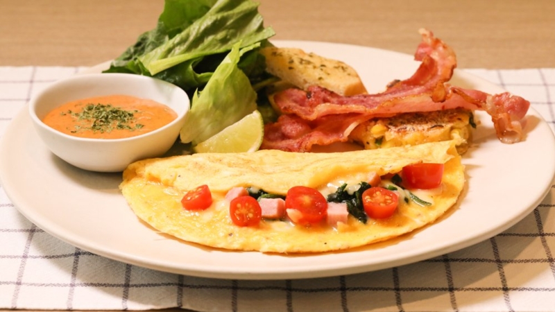- ออมเล็ตคอมโบ (ราคา 320 บาท) - ออมเล็ตเนื้อเนียนจากไข่ไก่ปลอดสาร สอดไส้ ชีส แฮม ผักโขมและมะเขือเทศ ทานคู่กับคอร์นเค้กสไตล์อเมริกันและเบคอนย่างกรอบ เสิร์ฟพร้อมซอสสไปซี่มาโยเม็ดมะม่วงหิมพานต์