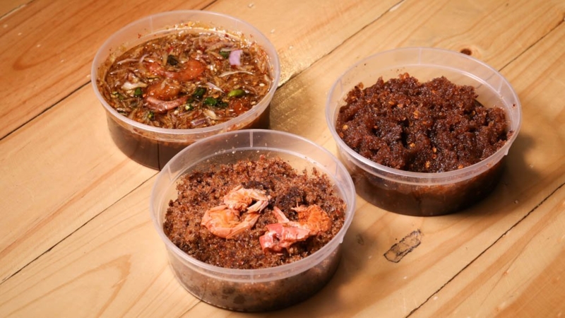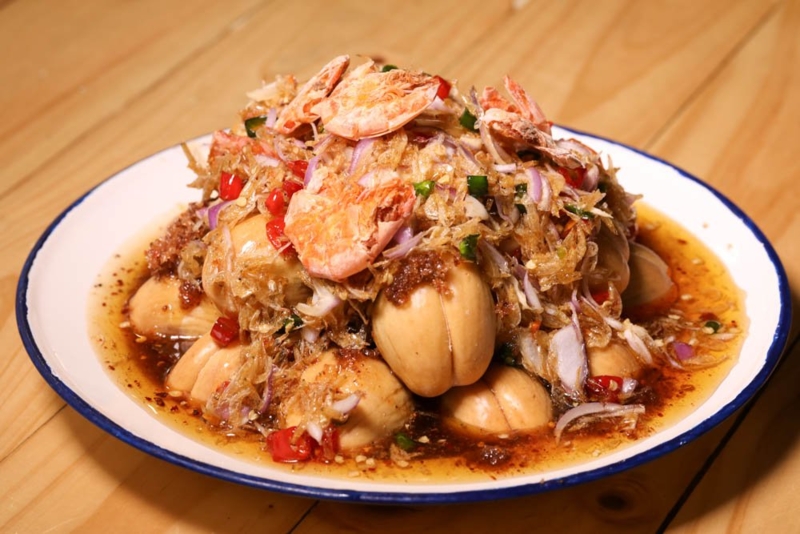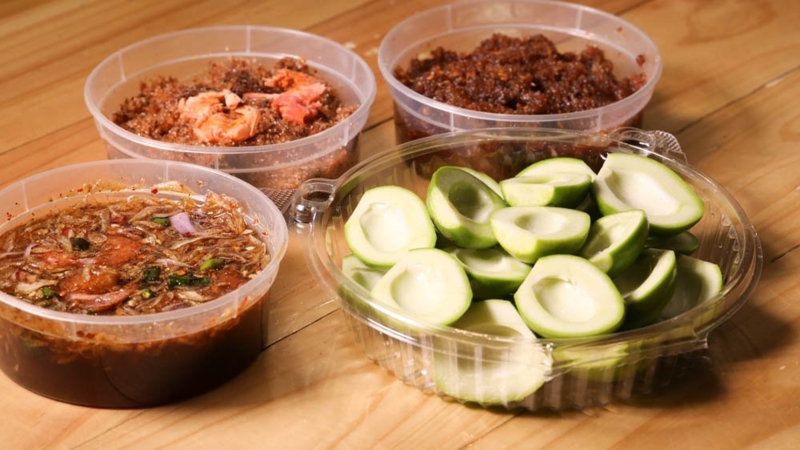 ร้านเจ๊นก กระท้อนซิ่ง มีผลไม้ตามฤดูกาลและผลไม้แช่อิ่ม ทานกับน้ำปลาหวานสูตรเด็ด เคี่ยวน้ำเชื่อมกว่า 8 ชั่วโมงด้วยเตาถ่าน เคี้ยวเต็มปากเต็มคำด้วยกุ้ง 3 ไซส์ ทีเด็ดที่ห้ามพลาด กระท้อนทรงเครื่อง, สละน้ำปลาหวาน และมะม่วงน้ำปลาหวาน