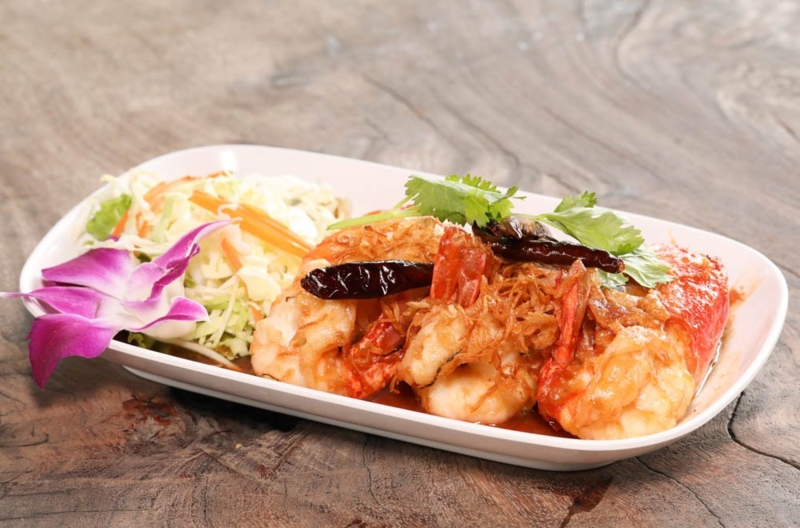 - กุ้งแม่น้ำซอสมะขาม (ราคาจานเล็ก 300 บาท / จานใหญ่ 500 บาท) - นำกุ้งมาแกะเปลือกที่หลัง ผ่านการทอดที่คุมอุณหภูมิไว้ เพื่อรักษาความฉ่ำของเนื้อกุ้งและมันกุ้งส่วนหัว ราดด้วยซอสมะขามที่ผ่านการเคี่ยวให้หอมตามสูตรหลายชั่วโมง พร้อมโรยด้วยหอมเจียวและพริกแห้งทอด