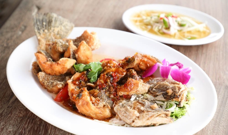 - ปลากะพงสองใจ (ราคา 380 บาท) - ปลากะพงทอดให้หนังกรอบ เหลืองสวย ส่วนบนราดซอสน้ำปลา ส่วนล่างราดซอส 3 รส
