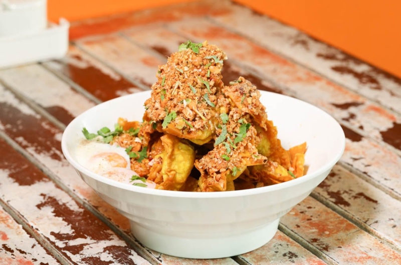 - ยำเกี๊ยวฟูภูเขาไฟ (ราคา 380 บาท) - จานนี้สามารถทานได้ประมาณ 3 - 4 คน เกี๊ยวหมูทอดร้อนๆ คลุกเคล้าใส่หมูสับ ถั่ว มะนาวสด พริกคั่วเอง จัดจ้านแบบยำแห้ง กัดมุมไหน ก็เจอหมูเน้นๆ ทุกคำ