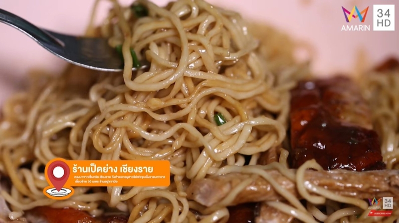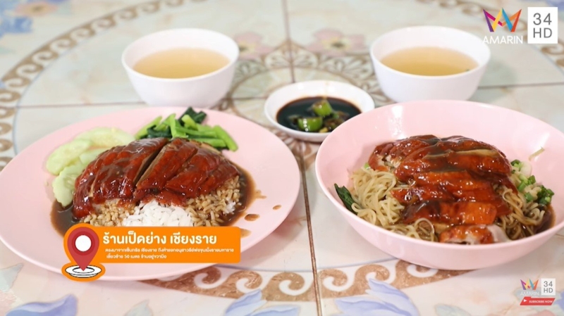 ร้านเป็ดย่าง เชียงราย ข้าวหน้าเป็ด เป็ดย่างหนังกรอบราดน้ำซอสรสชาติกำลังดี ข้าวนุ่ม เสิร์ฟมาพร้อมกับ น้ำซุปร้อนๆ ซดแล้วคล่องคอ ตามด้วยบะหมี่แห้งเป็ด ราดน้ำแบบเดียวกัน แต่ใช้บะหมี่ทำเอง ตบท้ายด้วยเกี๊ยวน้ำหมูหน้าเป็ด เนื้อเป็ดไม่มันหนังบางกรอบ ผักกวางตุ้งก็ลวกมากำลังดี