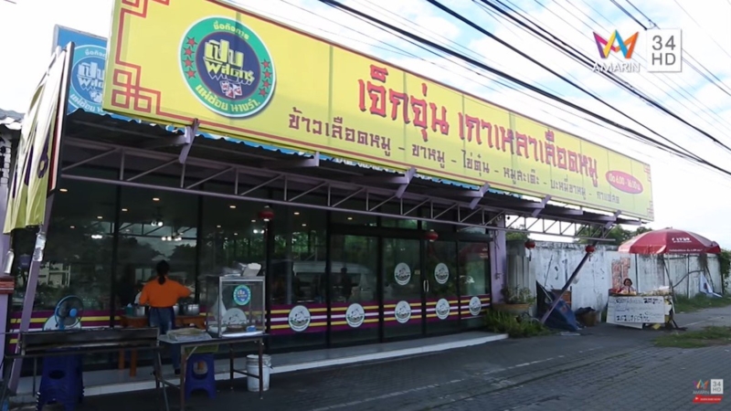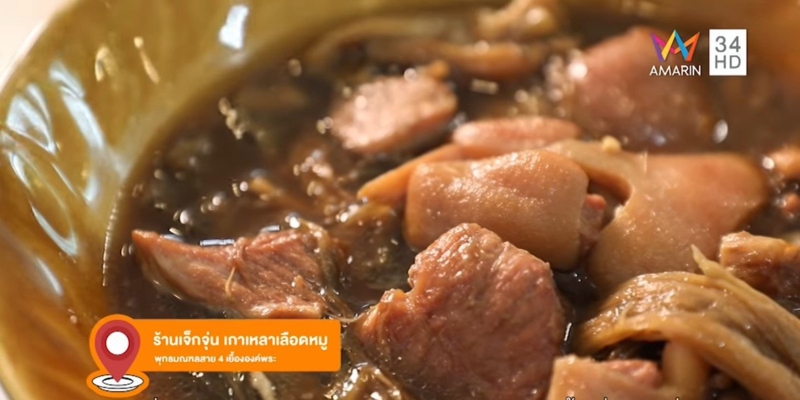 ร้านเจ๊กจุ่น ต้มเลือดหมู เป็นเจ้าแรกๆ ที่ใส่ผักจิงจูไฉ่ ซึ่งเป็นผักที่มีประโยชน์ต่อสุขภาพ ช่วยดีทอกซ์สารพิษ ไล่มะเร็ง น้ำซุปใส เลือดหมูนุ่ม เครื่องในสุกกำลังดี
