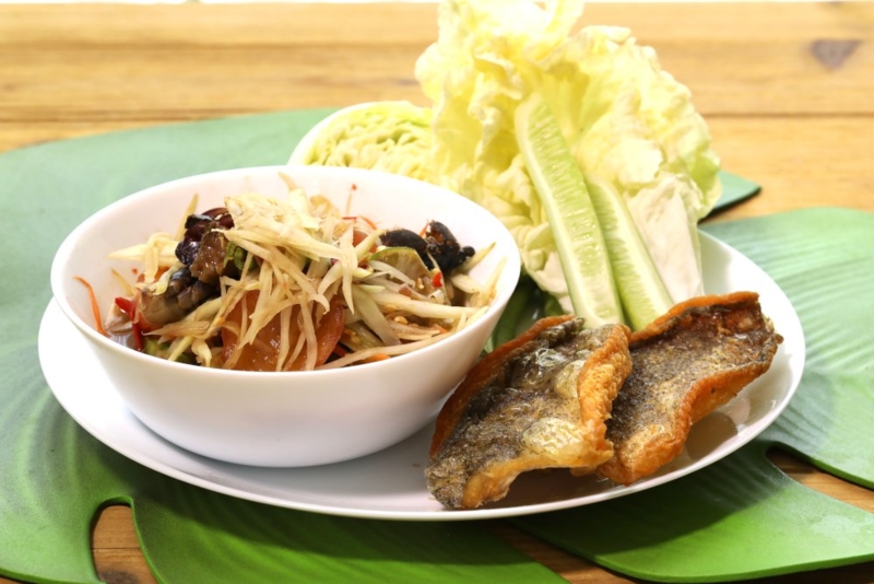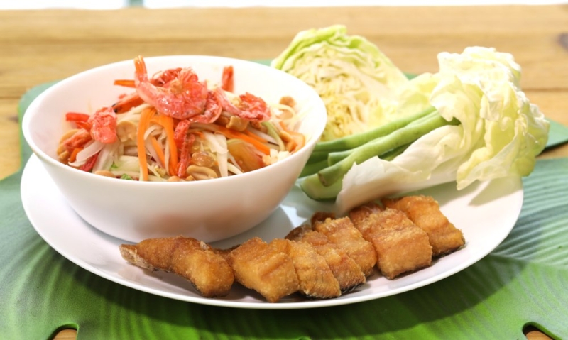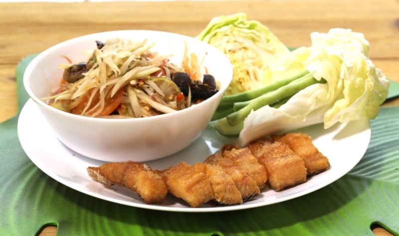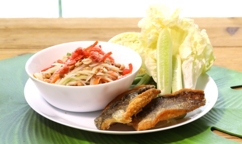 Set A ส้มตำสีอีแล่บ ทานกับ ปลาช่อนทอด99.-