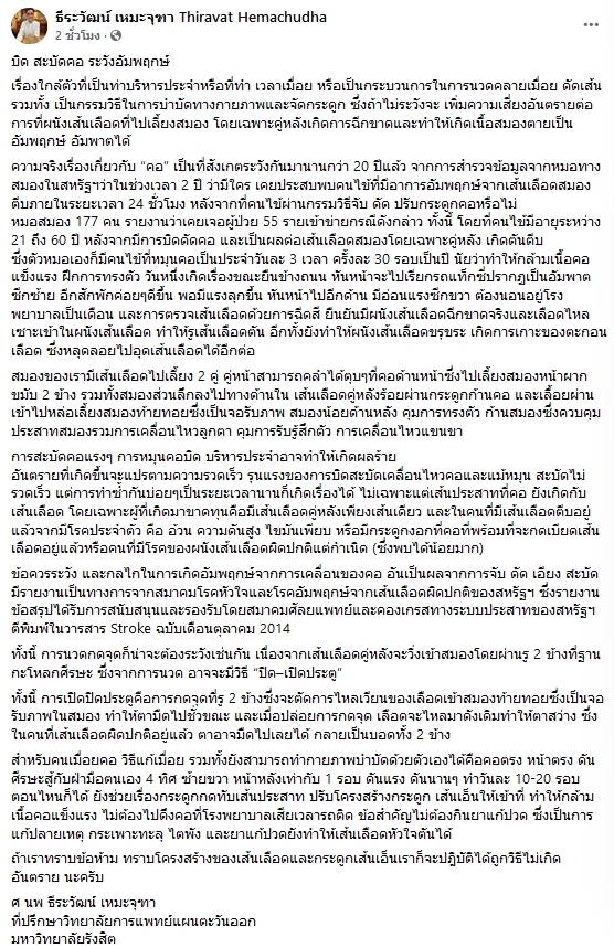 ศ. นพ. ธีระวัฒน์ เหมะจุฑา ที่ปรึกษาวิทยาลัยการแพทย์แผนตะวันออก มหาวิทยาลัยรังสิต โพสต์เตือน ปวดเมื่อยบิดสะบัดคอ ระวังอัมพฤกษ์ โดยมีรายละเอียดระบุว่า