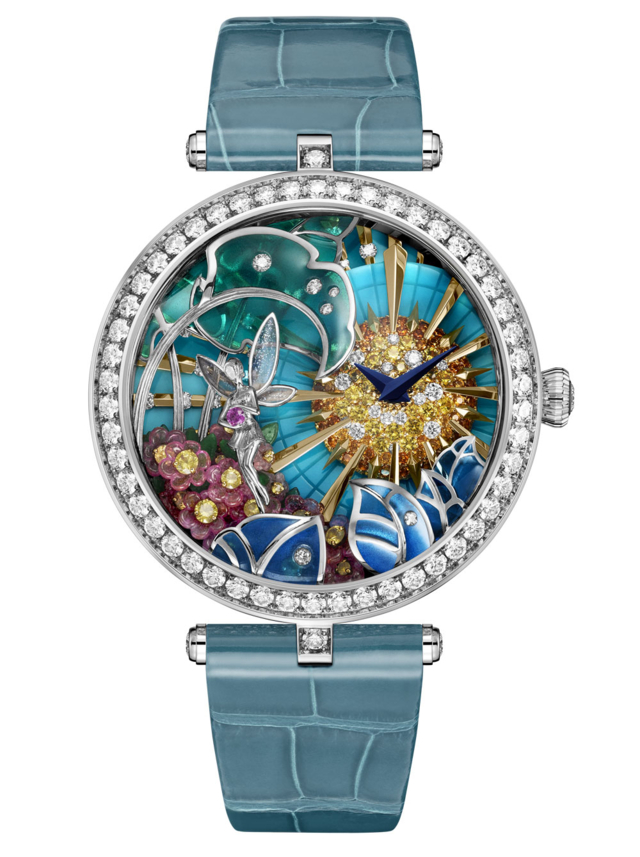 อันได้แก่ โกเมนสีส้ม สเปซซาไทต์, ไพลินสี และเพชร โดยอาศัยการฝังอัญมณีขึ้นตัวเรือนบนงานลงยาก่อมิติยกสูง เทคนิคนวัตกรรมมอบผลลัพธ์ราวกับหยาดหยดรัตนชาติกำลังลอยตัวอยู่กลางอากาศ สำหรับด้านหลังของตัวเรือน ความต่อเนื่องของเรื่องราวดำเนินผ่านงานสลักขึ้นรูปนางอัปสรโบยบิน ต้องใช้เวลาถึงสองปีไปกับการพัฒนา และ 180 ชั่วโมง กับงานประกอบหน้าปัดของนาฬิการุ่นนี้ ให้เป็นเสมือนเวทีแสดงความแยบคายทางหัตถกรรม และความเป็นเลิศในการสร้างสรรค์นาฬิกาข้อมือของ Van Cleef & Arpels