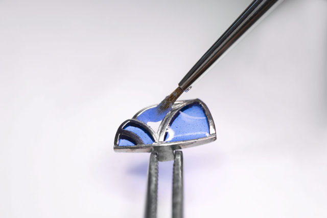 สำหรับหน้าปัดนาฬิกาข้อมือเลดี อารเปลส์รุ่น “สายลมแห่งคิมหันต์” Lady Arpels Brise d’Été ช่างฝีมือจิตรกรลงยาผู้เตรียมพร้อมด้วยการสวมแว่นตาขยายภาพ จะเริ่มลงสีบนกลีบดอกไม้ลงยาลายนูน (vallonné) หรือปีกผีเสื้อลงยาลายฉลุ (plique-à-jour) ด้วยการใช้พู่กันขนมาร์เทิน (marten เป็นสัตว์ชนิดหนึ่งคล้ายพังพอน) บรรจงไล่เฉดตามลำดับน้ำหนักโทนทีละสีลงตามตำแหน่งต่างๆ อย่างแม่นยำโดยอาศัยความประณีต พิถีพิถันระดับสูงจากโทนสีอ่อนสุด หรือสว่างสุดไปจนถึงเฉดเข้มสุด ความยากลำบาก ซึ่งต้องพึ่งพาความเพียรพยายาม และอดทนต่อการใช้เวลาสำหรับแต่ละขั้นตอนของแต่ละสี