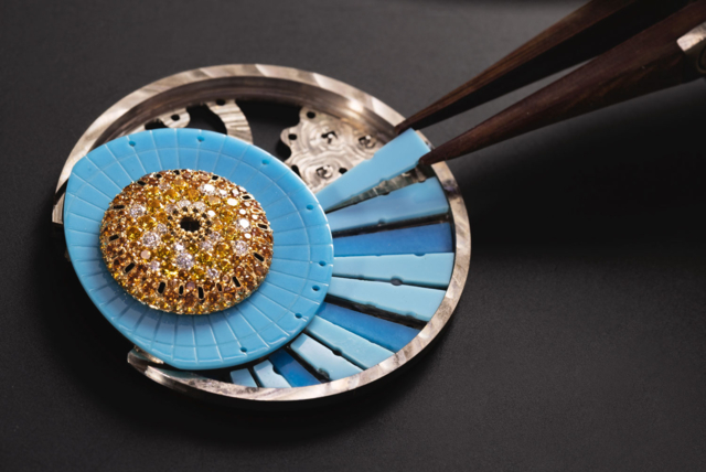 กลไกแผ่นจานหมุนควบคุมการเคลื่อนที่ 24 ชั่วโมงได้รับการพัฒนาขึ้นมาติดตั้งใต้หน้าปัด ก่อผลลัพธ์แสดงวิถีแห่งสุริยจักรวาลได้อย่างแยบยล บนแผ่นพลอยพรรณรายอะเวนจูรีน จากมูราโนจำลองมิติเวิ้งว้างแห่งห้วงเวหนไกลโพ้น ทวีความเป็นเลิศ ด้วยเทคนิคเซาะสลักโครงสร้างเปิดโปร่ง รองรับงานประดับดาวทองคำขาวฝังเพชรสุดวิจิตรบรรจง