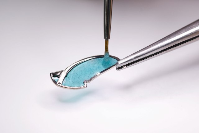 เทคนิคอันสลับซับซ้อนทางกระบวนการสร้างสรรค์นำมาซึ่งประติมากรรมขนาดจิ๋วด้วยกรอบทรงโครงสัณฐานคมชัด หลังผ่านความร้อนสูง วัสดุลงยาจะถูกเทอย่างเบามือลงบน “สื่อกลาง” หรือ “แกนขึ้นรูป” โลหะเหล็กกล้ากันสนิม (stainless-steel) ทีละหยด ทีละชั้น ให้เนื้อยาแต่ละเฉดสีค่อยๆ ทับซ้อนพร้อมกับตัดเจียน