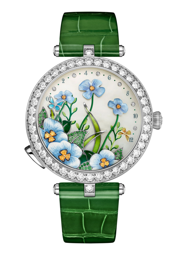 นาฬิกาข้อมือ Lady Arpels Brise d’Été ตัวเรือนทองคำสีขาวขนาด 38 มม. ประดับเพชรหน้าปัดแผ่นแม่มุกประดับโกเมนเขียวส่องซาโวไรต์ และโกเมนสีส้มสเปซซาไทต์ร่วมกับงานแม่มุก, จิตรกรรมย่อส่วน, งานลงยาลายฉลุ, งานลงยาร่องลาย และงานลงยาลายนูน กลไกขับเคลื่อนระบบขึ้นลานอัตโนมัติในตัว ติดตั้งระบบหุ่นกลขับเคลื่อนตามสั่ง สายคาดหนังจระเข้อำนวยต่อการสลับเปลี่ยนได้ด้วยตัวเอง