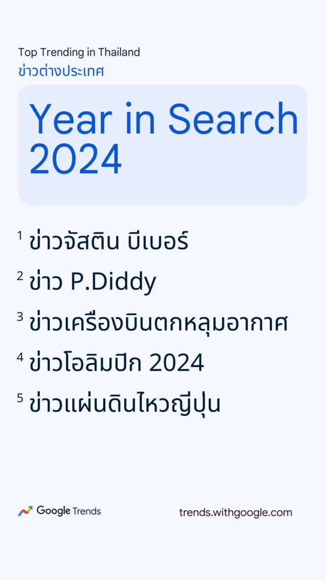 สำหรับข่าวต่างประเทศ ข่าวที่คนไทยให้ความสนใจที่สุดนั่นคือข่าวของนักร้องซูเปอร์สตาร์ "ข่าวจัสติน บีเบอร์" ที่เชื่อมโยงกับเหตุอื้อฉาวจาก "ข่าว P.Diddy" นอกจากนี้คนไทยยังให้ความสนใจกับอีเวนต์ระดับโลกอย่าง "ข่าวโอลิมปิก 2024" และ "ข่าวการเลือกตั้งสหรัฐฯ" อีกด้วย