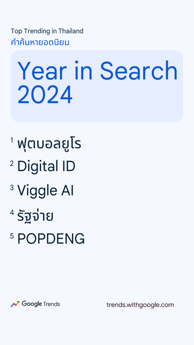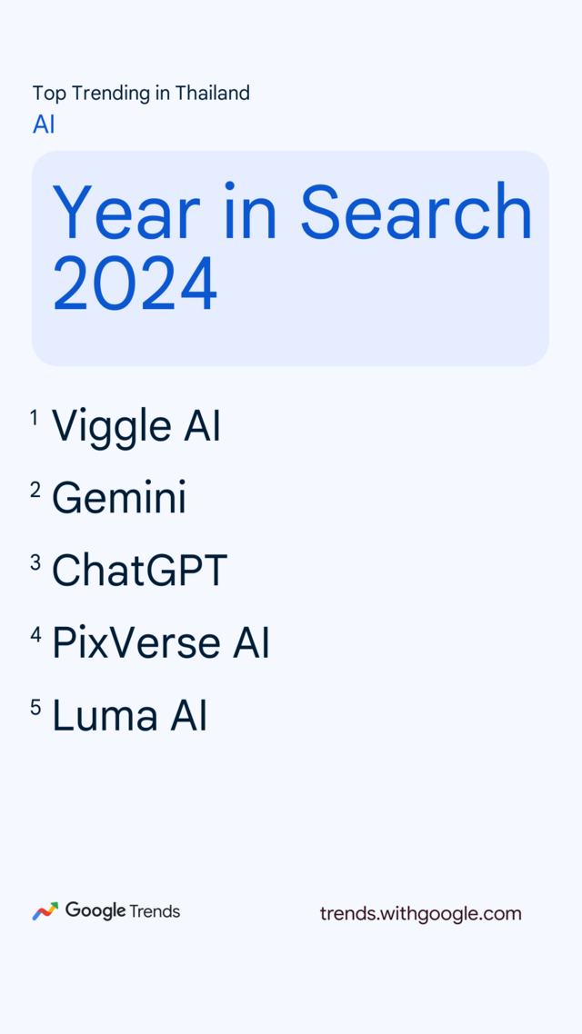 Google เผยคำค้นยอดนิยมของคนไทยในปี 2567 ปีนี้เทรนด์ AI มาแรง แซงบันเทิงเข้ามายึดท็อป 5 ไว้ได้