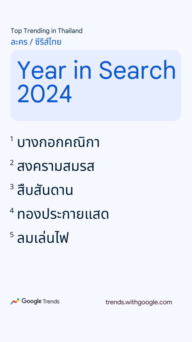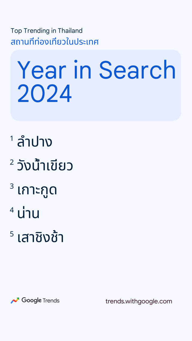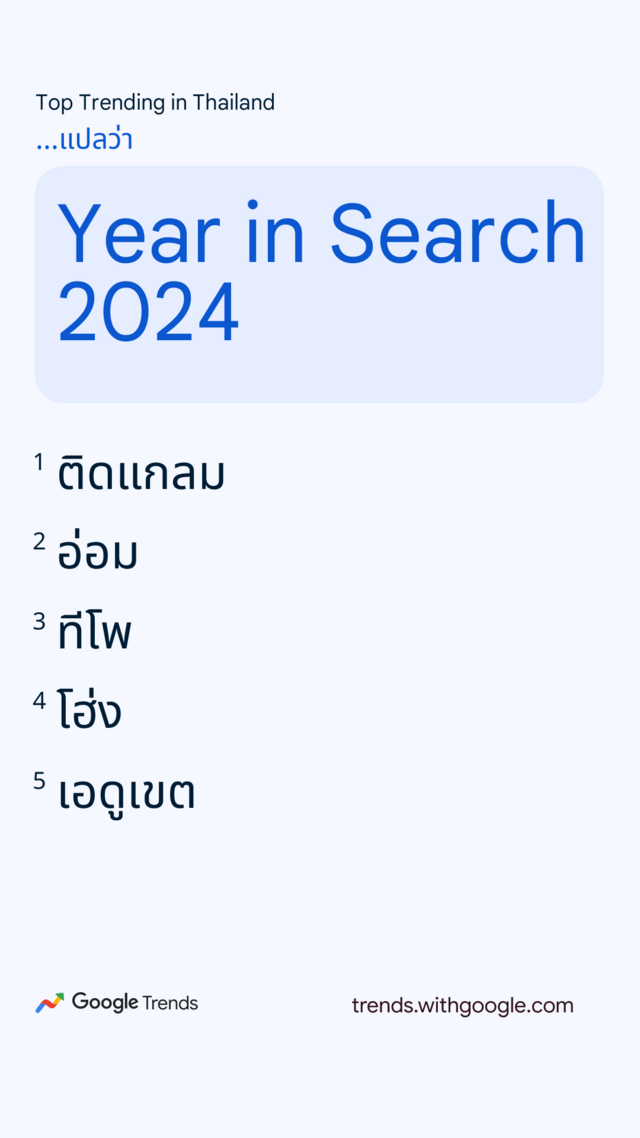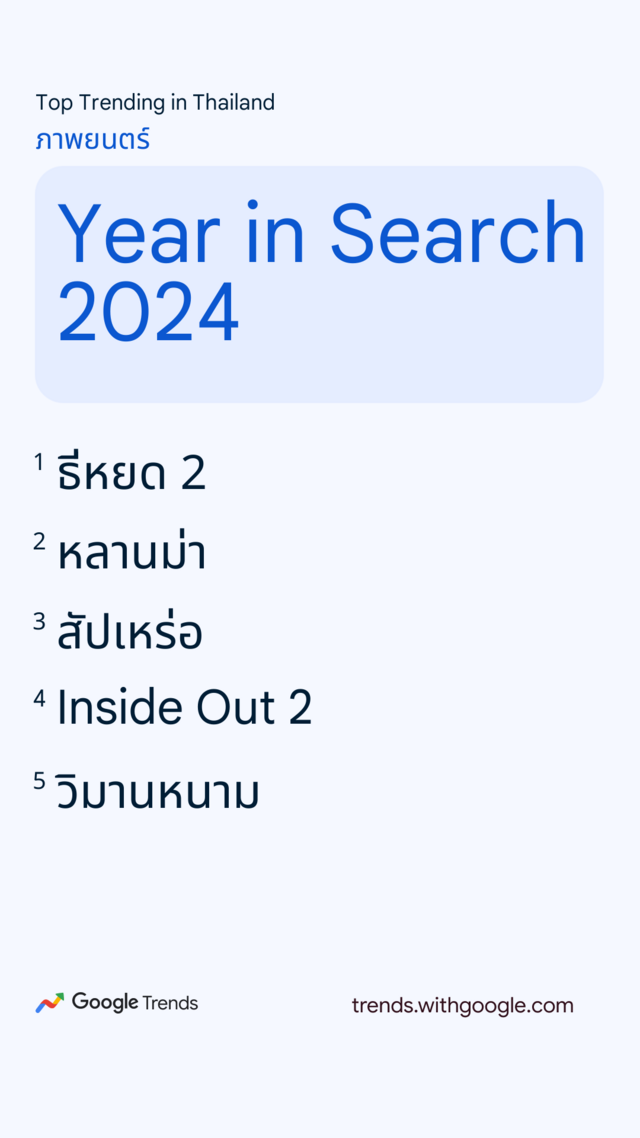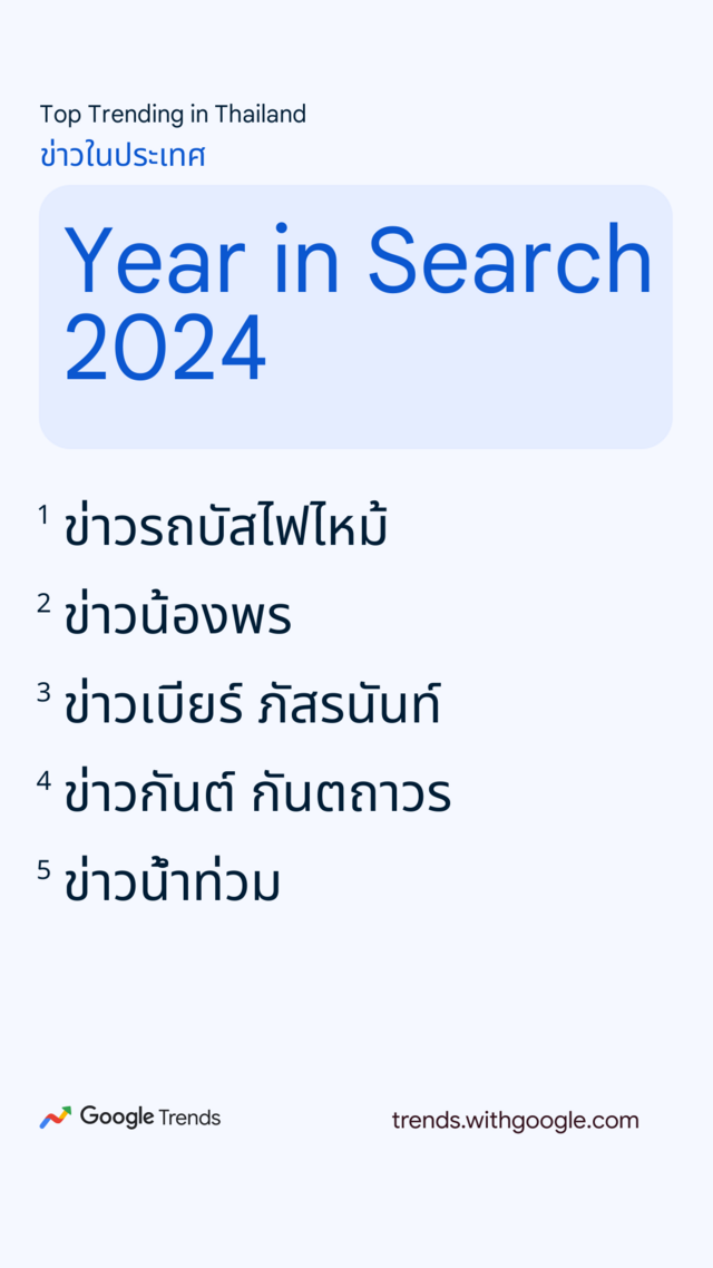 Google ประเทศไทย เปิดเผยผลการค้นหายอดนิยมประจำปี 2567 หรือ "Year in Search 2024" ตั้งแต่ข่าวสารทั้งในประเทศและต่างประเทศ ความบันเทิง สถานที่ท่องเที่ยว บุคคลที่เป็นกระแส รวมถึงวลีฮิต สูตรอาหาร ซึ่งสะท้อนถึงเทรนด์และพฤติกรรมการค้นหาของคนไทยตลอดปีที่ผ่านมา