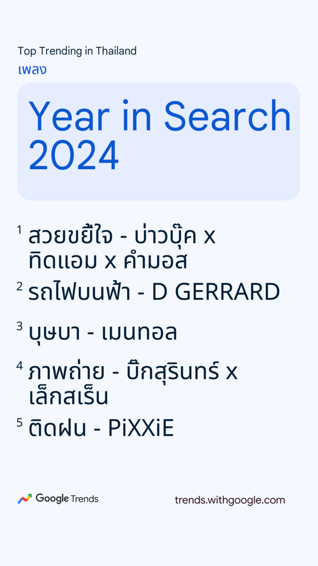 ข้ามมาดูในฝั่งของเพลง ปีนี้เพลงแนวลูกทุ่งอินดี้ได้รับความนิยม โดยเพลง "สวยขยี้ใจ" ของ บ่าวบุ๊ค x ทิดแอม x คำมอส ขึ้นแท่นคำค้นหาอันดับ 1 ส่วนกระแสทีป๊อปก็พาให้หลายเพลงติดอันดับค้นหา เช่น รถไฟบนฟ้า - D GERRARD, ติดฝน - PiXXiE, เพลงที่เธอไม่ฟัง - Bedroom Audio, ใจสมใจ - อูน TheChanisara โดยมีเพลงต่างประเทศ APT. - ROSÉ & Bruno Mars ติดอันดับเพลงยอดนิยมในการค้นหาในปีนี้มาแค่เพลงเดียว