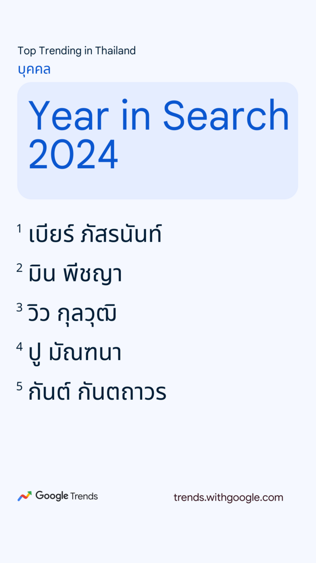 และสำหรับบุคคลในกระแสที่มีการค้นหามากที่สุดในปี 2567 ได้แก่ "เบียร์ ภัสรนันท์" หรือ เบียร์ เดอะวอยซ์ ที่ปีนี้มีหนัง ซีรีส์ เพลง และข่าวต่างๆ ออกมาปรากฏบนหน้าฟีดทั้งปี ตามมาด้วยสองบอสดอ ไอคอน คือ "มิน พีชญา" กับ "กันต์ กันตถาวร" ส่วนนักกีฬาที่ติดเข้ามาในปีนี้นักแบดมินตันเหรียญเงินโอลิมปิก 2024 "วิว กุลวุฒิ"