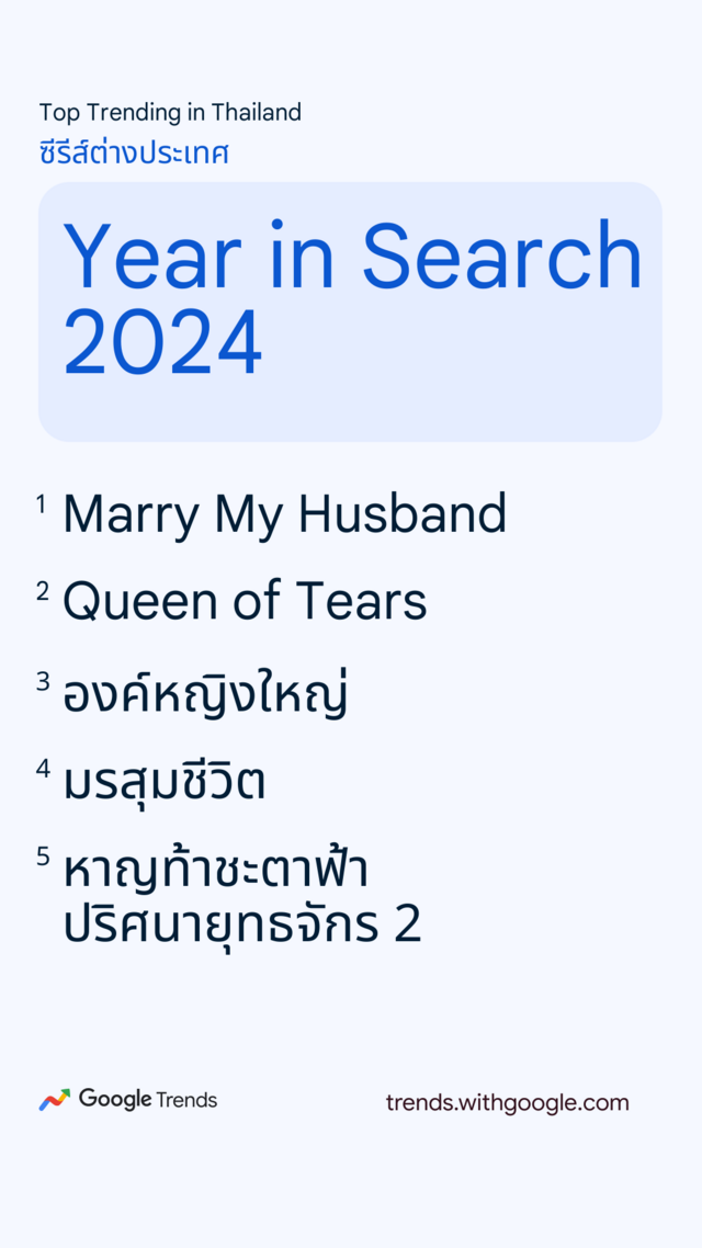 ส่วนซีรีส์ต่างประเทศ คอนเทนต์จากเกาหลีใต้ยังครองใจผู้ชมชาวไทย โดยซีรีส์ย้อนเวลามาแก้แค้นอย่าง "Marry My Husband" ติดอันดับการค้นหามากที่สุด แต่ที่น่าจับตาคือกระแสซีรีส์จีนที่มากขึ้นเรื่อยๆ ในเมืองไทย เห็นได้จากใน 10 อันดับนี้มีซีรีส์จีนติดมาหลายเรื่อง เช่น องค์หญิงใหญ่, มรสุมชีวิต, หาญท้าชะตาฟ้า ปริศนายุทธจักร 2, ดรุณควบม้าขาวเมามายลมวสันต์, กับดักรักบอสตัวร้าย เรียกได้ว่ากระแสเบียดกันมาเลย และมีสิทธิ์แซงหากสะสมแฟนคลับไว้ได้แบบนี้ ส่วนซีรีส์จากฝั่งตะวันตกปีนี้ดูแผ่วไป ไม่ติดอันดับเลยสักเรื่อง