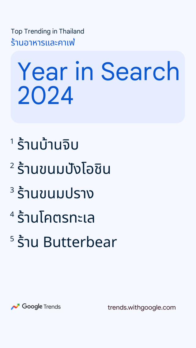 ร้านอาหารและคาเฟ่ ปีนี้ร้านยอดฮิตในโซเชียลต่างพาเหรดติดอันดับการค้นหากันเพียบ โดยมี "ร้านบ้านจิบ" เข้ามาเป็นอันดับ 1 ร้านขนมปังโอชิน