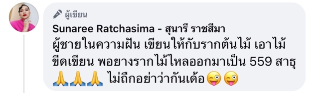 อีกทั้ง สุนารี ยังได้คอมเมนต์ใต้โพสต์ดังกล่าวเอาโชคลาภมาฝากแฟนๆอีกด้วย โดยระบุว่า … ผู้ชายในความฝัน เขียนให้กับรากต้นไม้ เอาไม้ขีดเขียน พอยางรากไม้ไหลออกมาเป็น 559 สาธุ🙏🙏🙏 ไม่ถืกอย่าว่ากันเด้อ