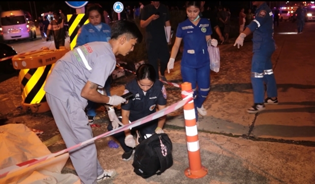 ที่เกิดเหตุเจ้าหน้าที่พบศพนักเรียนชาย ม.4 โรงเรียนแห่งในตัวเมืองชุมพร ทราบชื่อภายหลังคือ นายกฤตเมธ (สงวนนามสกุล) อายุ 16 ปี สภาพนอนแขนขากระดูกหัก นอนหงายเสียชีวิตข้างแบริเออร์คอนกรีต บริเวณเชิงสะพานข้าทางรถไฟของถนนทางหลวงชนบท สาย จ ขาอออก ก่อนถึงทางแยกเชื่อมเส้นทางสายหลักถนนเอเชีย 41 เพียง 700 เมตร ส่วนอีกสองศพถูกชนกระเด็นตกจากสะพานข้ามรางรถไฟ ทราบชื่อคือ ด.ญ.บุณยานุช (สงวนนามสกุล) อายุ 14 ปี อยู่ ม.2 โรงเรียนแห่งเดียวกันกับพี่ชาย และนางเย็นจิตร (สงวนนามสกุล) อายุ 52 ปี นอนเสียชีวิตอยู่บริเวณเกาะกลาง ของถนนคู่ขนาน โดยทั้งสองอยู่ในสภาพกระดูกหักศีรษะแตกเลือดนองถนน เจ้าหน้าที่จึงได้ใช้ผ้าคลุมศพ