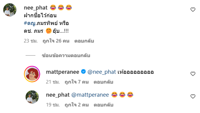 ด้านคุณแม่นี คุณแม่ของแมท ได้เข้ามาคอมมเนต์ว่า "ฝากชื่อไว้ก่อน #ดญ.ภมรทิพย์ หรือ ดช. ภมร อุ๊บ…!!!"