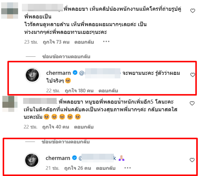 ด้านแฟนคลับอีกคนคอมเมนต์ว่า "พี่พลอยขา หนูขอพี่พลอยน้ำหนักเพิ่มอีก 5 โลนะคะ เห็นในติกต๊อกที่แฟนคลับลงเป็นห่วงสุขภาพพี่มากๆ ค่ะ กลับมาสดใสนะคะมัม" ด้าน “พลอย เฌอมาลย์” ตอบกลับด้วยอิโมจิขอบคุณ