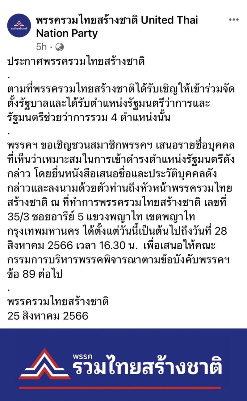 พรรคฯ ขอเชิญชวนสมาชิกพรรคฯ เสนอรายชื่อบุคคลที่เห็นว่าเหมาะสมในการเข้าดำรงตำแหน่งรัฐมนตรีดังกล่าว โดยยื่นหนังสือเสนอชื่อและประวัติบุคคลดังกล่าวและลงนามด้วยตัวท่านถึงหัวหน้าพรรครวมไทยสร้างชาติ ณ ที่ทำการพรรครวมไทยสร้างชาติ เลขที่ 35/3 ซอยอารีย์ 5 แขวงพญาไท เขตพญาไท กรุงเทพมหานคร ได้ตั้งแต่วันนี้เป็นต้นไปถึงวันที่ 28 สิงหาคม 2566 เวลา 16.30 น. เพื่อเสนอให้คณะกรรมการบริหารพรรคพิจารณาตามข้อบังคับพรรคฯ ข้อ 89 ต่อไป