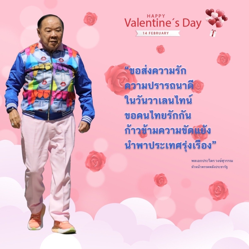 พลเอกประวิตร วงษ์สุวรรณ หัวหน้าพรรพลังประชารัฐ ส่งความรักและความปราถนาดี เนื่องในวันวาเลนไทน์ โดยส่งข้อความพร้อมรูปหวาน ๆ ระบุ