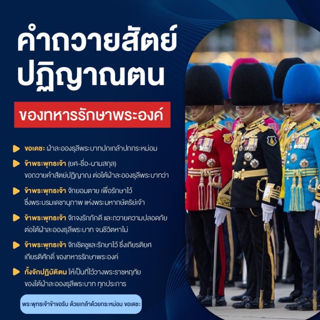 สำหรับในพิธีนี้ พลเอก ทรงวิทย์ หนุนภักดี ผู้บัญชาการทหารสูงสุด จะเป็นผู้นำกราบบังคมทูลพระกรุณาถวายพระพรชัยมงคล แล้วกล่าวนำทหารรักษาพระองค์ทุกนายถวายสัตย์ปฏิญาณตน ด้วยถ้อยคำ ดังนี้