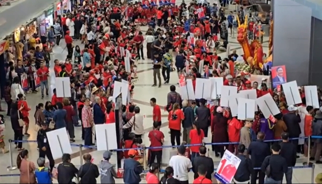 วันที่ 11 ธ.ค. 67 ผู้สื่อข่าวรายงานบรรยากาศ บริเวณอาคารผู้โดยสารขาเข้าภายในประเทศ ท่าอากาศยานนานาชาติอุบลราชธานี บรรดาแกนนำเสื้อแดงจากหลายจังหวัดในภาคอีสานต่างทยอยเดินทางเข้ามาต้อนรับนาย ทักษิณ ชินวัตร อดีตนายกรัฐมนตรี พร้อมทั้งถือป้ายสนับสนุน นาย กานต์ กัลป์ตินันท์ ผู้สมัครนายก อบจ.อุบลราชธานี ของพรรคเพื่อไทย ท่ามกลางการดูแลความปลอดภัยของเจ้าหน้าที่ทั้งใน และนอกเครื่องแบบโดยรอบอาคารผู้โดยสารและรอบสนามบิน