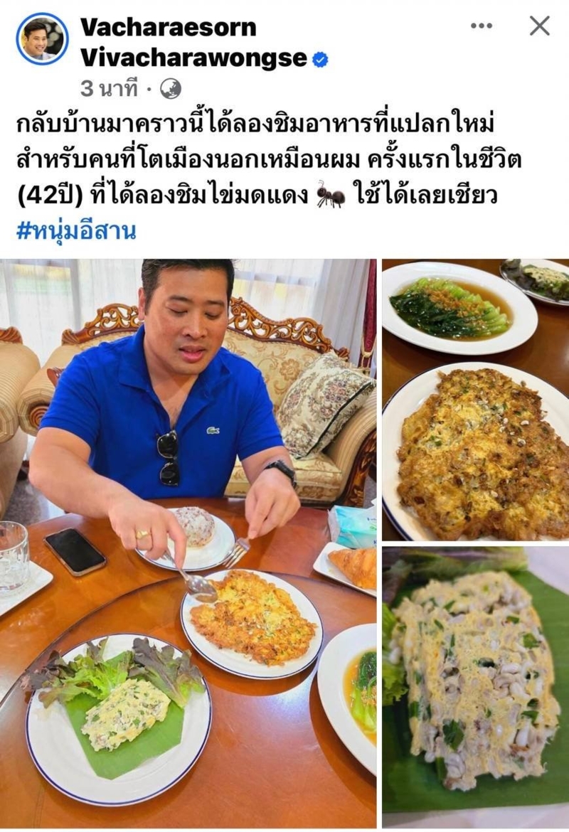วันนี้ (9 มี.ค. 67) ท่านอ้น วัชเรศร วิวัชรวงศ์ โพสต์ เฟซบุ๊กส่วนตัว Vacharaesorn Vivacharawongse พร้อมรูปภาพขณะรับประทานเมนูไข่มดแดงเป็นครั้งแรก โดยบนโต๊ะมีเมนู เช่น ไข่เจียวมดแดง โดยท่านอ้นระบุว่า