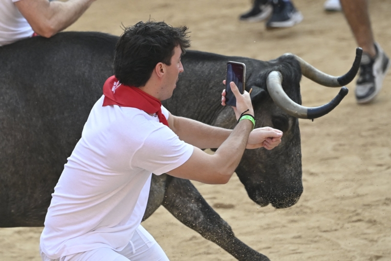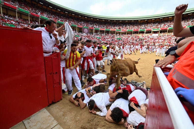 สีสันของงานนี้ อยู่ที่การรวมตัวของเหล่านักสู้วัวกระทิง เป็นหนุ่มๆ สายฟิตแรงขาต้องดี ที่จับกลุ่มและลุยเดี่ยว วิ่งหนีกระทิงดุ 6 ตัวที่ไล่ตามหลังมาติดๆ ไปตามถนนแคบๆ เป็นระยะทางราว 800 เมตรใช้เวลาเพียง 2 นาทีครึ่ง ซึ่งประเดิมวันแรกของงาน มีผู้ร่วมงานได้รับบาดเจ็บไปแล้ว 6 คน ซึ่งทั้งหมดถูกนำตัวส่งโรงพยาบาลเรียบร้อยแล้ว โชคดีที่ไม่มีใครเป็นอันตรายถึงชีวิต