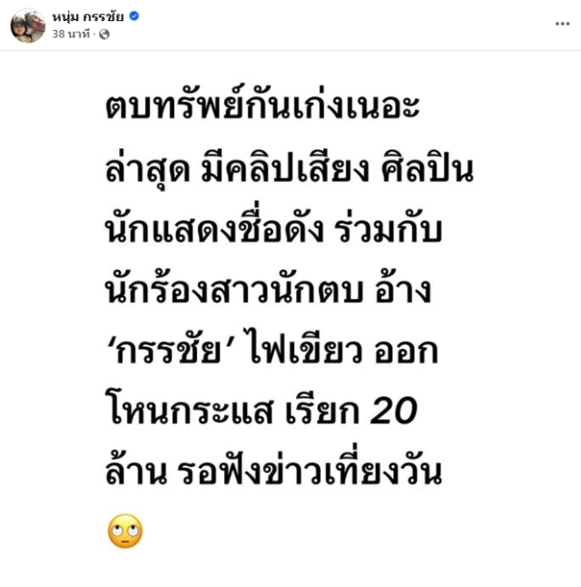 วันนี้ (12พ.ย.67) เผือกร้อนยังไม่หมด สำหรับประเด็นตบทรัพย์ที่กำลังเป็นกระแสข่าวกันอยู่ในขณะนี้ เพราะล่าสุด หนุ่ม กรรชัย กำเนิดพลอย พิธีกรชื่อดัง ได้ออกมาโพสต์เฟซบุ๊ก ชวนสงสัย ระบุว่า “ตบทรัพย์กันเก่งเนอะ ล่าสุดมีคลิปเสียง ศิลปิน นักแสดงชื่อดัง ร่วมกับนักร้องสาวนักตบ อ้าง กรรชัย ไฟเขียว ออกรายการโหนกระแส เรียก 20 ล้าน รอฟังข่าวเที่ยงวัน”