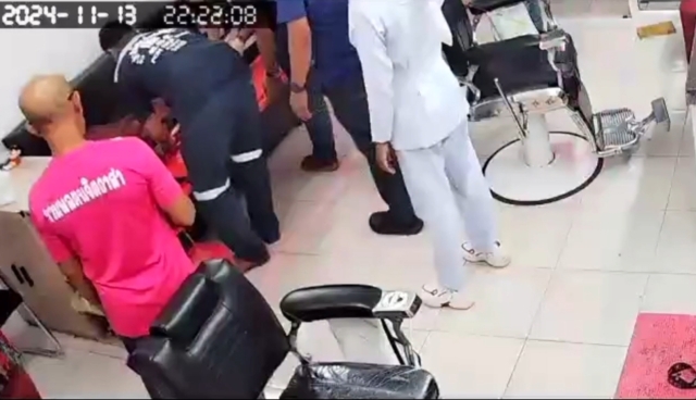 ภาพจากกล้องวงจรปิดภายในร้านตัดผมบริเวณใกล้เคียงโรงงาน เผยนาที ป๋าเทพ ซุปเปอร์หม่ำ กับเจ้าหน้าที่กู้ภัย และพลเมืองดีช่วยกันปฐมพยาบาลเบื้องต้น ก่อนนำตัวอาม่าขึ้นรถพยาบาลไปตรวจร่างกาย ที่โรงพยาบาลไทรน้อย