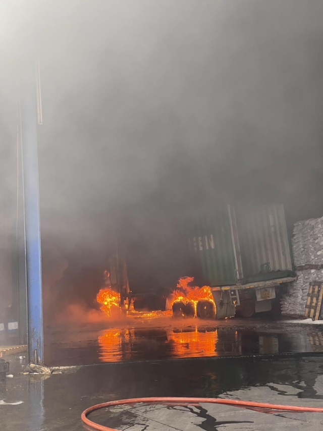 จากการตรวจสอบยังพบรถบรรทุกที่จอดภายในโรงงาน โดนไฟไหม้ลามเข้ามา ทำให้รถบรรทุกเสียหายเกือบทั้งคันด้วย