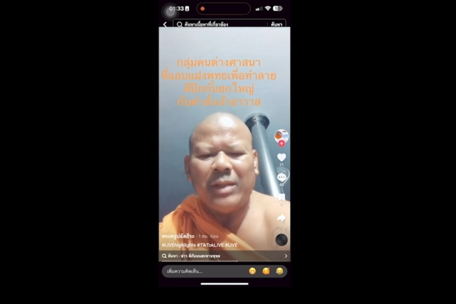 ขณะที่ในช่วงเวลาประมาณ 00.45 น. ในโซเชียลTiktok ชื่อพระครูปลัดธีระ ได้มีการโพสต์คลิปความยาวประมาณ 1 นาที โดยมีการตอบโต้ และแสดงการไม่เห็นด้วย ซึ่งได้กล่าวถึงนาย กัน จอมพลัง ทนายพจน์ และหลวงพี่น้ำฝน โดยมีลักษณะบอกว่าเป็นการกลั่นแกล้ง และเป็นพวกทำลายศาสนาที่มาจ้องทำลายตนเอง โดยขณะที่ก่อนหน้าได้มีการนำหนังสือจากเจ้าอาวาสวัดสามชุกในการสั่งให้ตนเองพ้นจากวัดสามชุกในวันนี้ และหนังสือราชกิจจานุเบกษามาตราที่ 27 ขึ้นมาแสดง และลงว่าเป็นกลุ่มขบวนการทำลายพระสงฆ์ และพระพุทธศาสนาปลุกระดมให้ความให้ร้ายพระครูปลัดธีระ โดยเบียดเบียนข้อกฎหมาย ทั้งนี้ในส่วนคอมเมนต์ต่างๆ ที่ปรากฏในห้องแสดงความคิดเห็นได้มีการสอบถาม และให้ความเห็นว่าพระครูธีระได้ผลจากสภาพความเป็นพระสงฆ์แล้ว