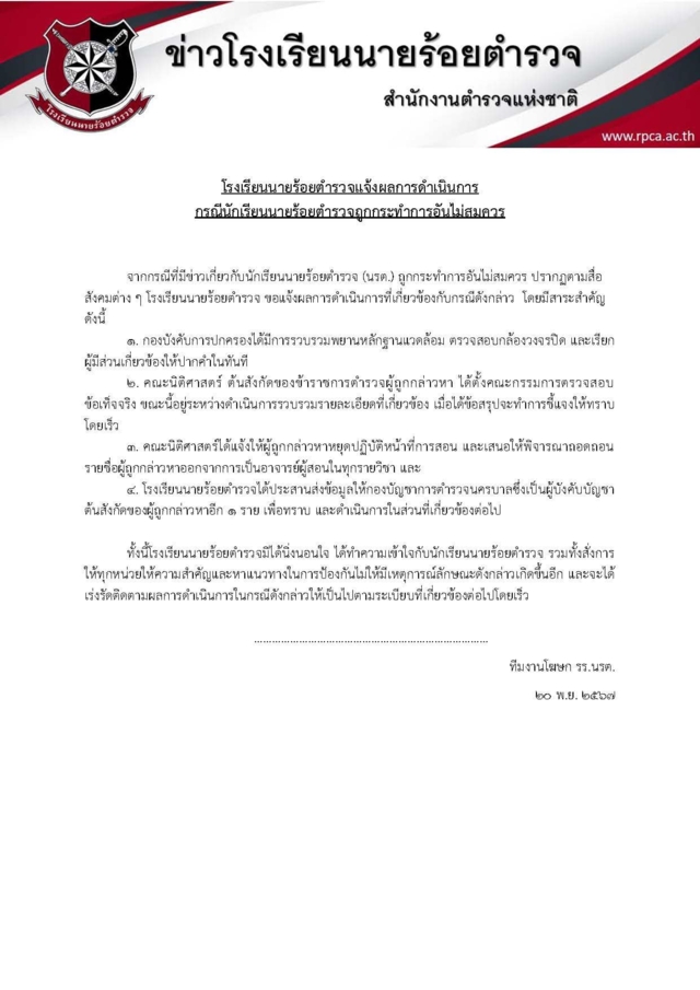 “จากกรณีที่มีข่าวเกี่ยวกับนักเรียนนายร้อยตำรวจ (นรต.) ถูกกระทำการอันไม่สมควร ปรากฏตามสื่อ สังคมต่างๆ โรงเรียนนายร้อยตำรวจ ขอแจ้งผลการดำเนินการที่เกี่ยวข้องกับกรณีดังกล่าว โดยมีสาระสำคัญ ดังนี้”