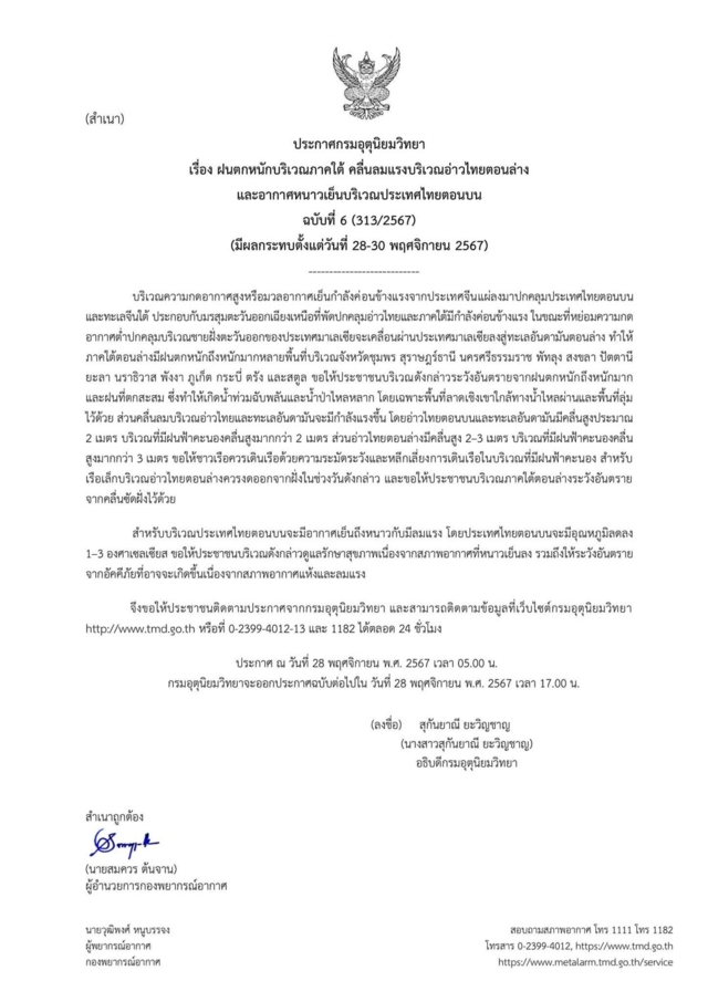 วันที่ 28 พ.ย. 67 น.ส.สุกันยาณี ยะวิญชาญ อธิบดีกรมอุตุนิยมวิทยา ลงนามใน ประกาศกรมอุตุนิยมวิทยา เรื่อง ฝนตกหนักบริเวณภาคใต้ คลื่นลมแรงบริเวณอ่าวไทยตอนล่าง และอากาศหนาวเย็นบริเวณประเทศไทยตอนบน ฉบับที่ 6 (313/2567) (มีผลกระทบตั้งแต่วันที่ 28-30 พ.ย. 67) ระบุว่า บริเวณความกดอากาศสูงหรือมวลอากาศเย็นกำลังค่อนข้างแรงจากประเทศจีนแผ่ลงมาปกคลุมประเทศไทยตอนบนและทะเลจีนใต้ ประกอบกับมรสุมตะวันออกเฉียงเหนือที่พัดปกคลุมอ่าวไทยและภาคใต้มีกำลังค่อนข้างแรง