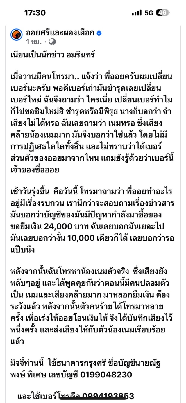 เพจเฟซบุ๊ก “ออยศรีและผองเผือก” โพสต์เตือนภัยหลังโดนมิจฉาชีพ เนียนเป็นนักข่าว อมรินทร์ โดยระบุข้อความว่า “เนียนเป็นนักข่าว อมรินทร์”