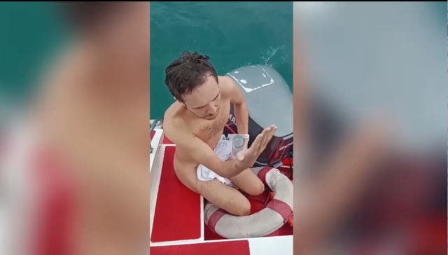 จากนั้นรีบโยนห่วงยางเสื้อชูชีพให้นักท่องเที่ยวคนดังกล่าว และช่วยเรือเอาขึ้นเรือมาได้ในสภาพเปลือยกาย ไม่สวมใส่เสื้อผ้าด้วยท่าทีหมดแรง และอิดโรย ตามร่างกายมีบาดแผลเปื่อยโดนน้ำทะเลกัดเป็นแห่งๆ จึงเอาขนหนูคลุมปิดกายเอาไว้ และหาน้ำเปล่าให้ดื่มด้วยความกระหาย ก่อนจะพาตัวไปส่งให้เจ้าหน้าที่แขวงเกาะล้านรับตัวไปดำเนินการต่อ ถือว่าโชคดีที่วันนี้กระแสน้ำไม่แรงพัดไปไกล หรือไม่โชคร้าย อาจจะมีเรือมองไม่เห็นแล่นผ่านโดนใบพัดเฉือดเอาได้