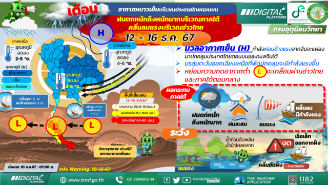 ในขณะที่มรสุมตะวันออกเฉียงเหนือที่พัดปกคลุมอ่าวไทยและภาคใต้จะมีกำลังแรงขึ้นประกอบกับในช่วงวันที่ 13 – 15 ธันวาคม 2567 หย่อมความกดอากาศต่ำบริเวณทะเลีจนใต้ตอนล่างจะเคลื่อนผ่านอ่าวไทยและภาคใต้ตอนกลางลงสู่ทะเลอันดามัน ทำให้ภาคใต้มีฝนเพิ่มขึ้นและมีฝนตกหนักถึงหนักมากบางแห่ง ขอให้ประชาชนบริเวณภาคใต้ระวังอันตรายจากฝนตกหนักถึงหนักมากและฝนที่ตกสะสม ซึ่งอาจทำให้เกิดน้ำท่วมฉับพลันและน้ำป่าไหลหลาก โดยเฉพาะพื้นที่ลาดเชิงเขาใกล้ทางน้ำไหลผ่านและพื้นที่ลุ่มไว้ด้วย คลื่นลมบริเวณอ่าวไทยจะมีกำลังแรงขึ้น โดยอ่าวไทยมีคลื่นสูง 2 - 3 เมตร บริเวณที่มีฝนฟ้าคะนองคลื่นสูงมากกว่า 3 เมตร ขอให้ประชาชนในบริเวณภาคใต้ฝั่งอ่าวไทยระวังอันตรายจากคลื่นที่ซัดเข้าหาฝั่ง ชาวเรือเดินเรือด้วยความระมัดระวังและหลีกเลี่ยงการเดินเรือในบริเวณที่มีฝนฟ้าคะนอง สำหรับเรือเล็กบริเวณอ่าวไทยควรงดออกจากฝั่งในช่วงวันดังกล่าว