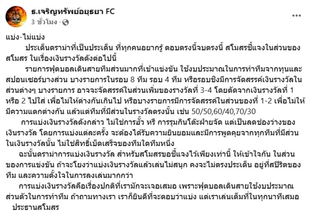 แต่ล่าสุดเพจเฟซบุ๊ก ธ.เจริญทรัพย์อยุธยา FC ได้ออกมาโพสต์ชี้แจงระบุว่า